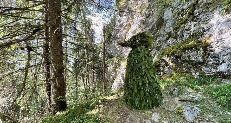 OOOOH! At the bottom of the cliff, a creature stands on a small rise. The creature focuses on her surroundings. She looks around. Her dress of ferns hints at the special nature of Grindelwald. Inside the creature is a pile of stones. The creature is ephemeral. Over time, only the pile of stones will remain, on which moss will grow again.